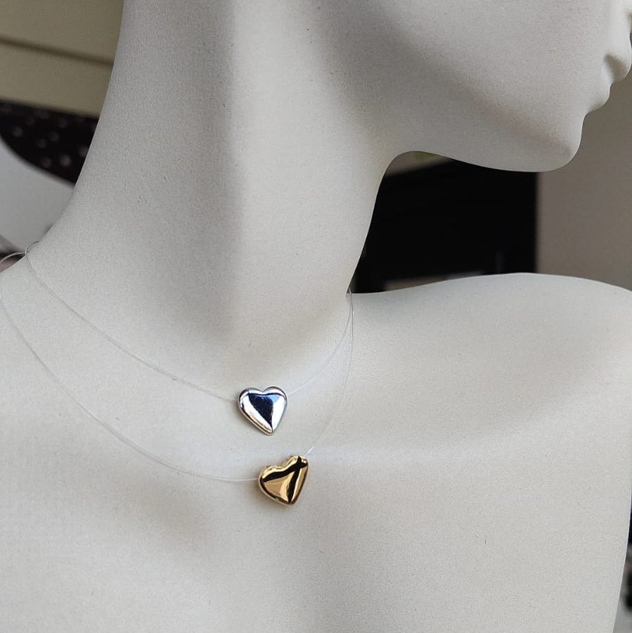 Colar fio de nylon 40cm com pingente de coração dourado banhado a ouro 18k.